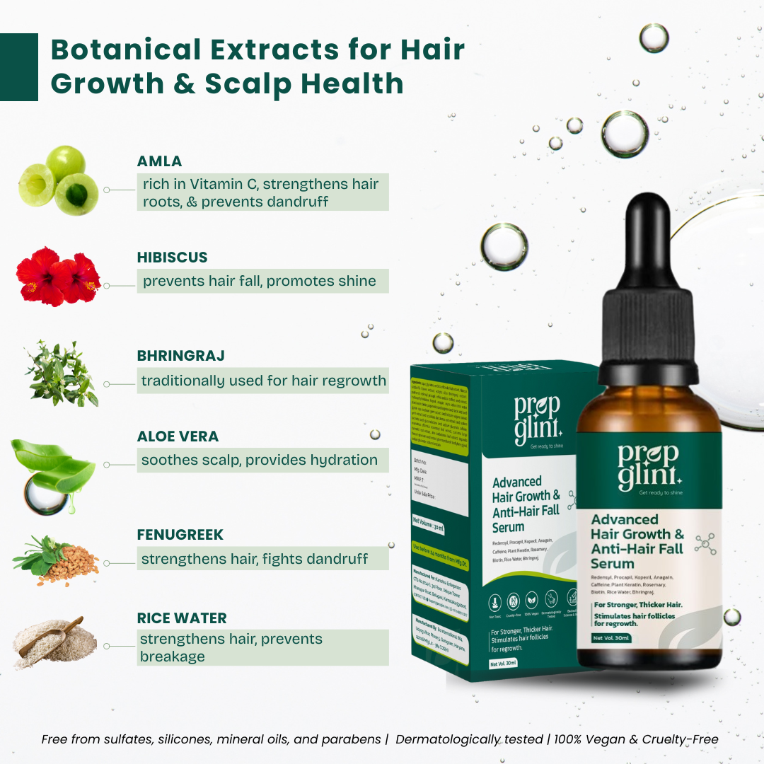 Prep Glint Hair Scalp Serum is a science-backed, non-oily formulation designed to address hair fall, thinning, and weak roots by nourishing the scalp and activating hair follicles naturally.